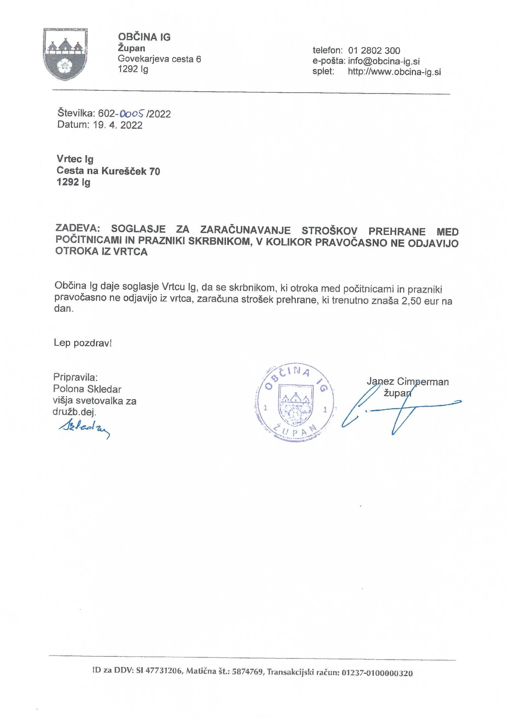 ZARAČUNAVANJE STROŠKOV PREHRANE MED POČITNICAMI IN PRAZNIKI SKRBNIKOM, V KOLIKOR PRAVOČASNO NE ODJAVIJO OTROKA IZ VRTCA